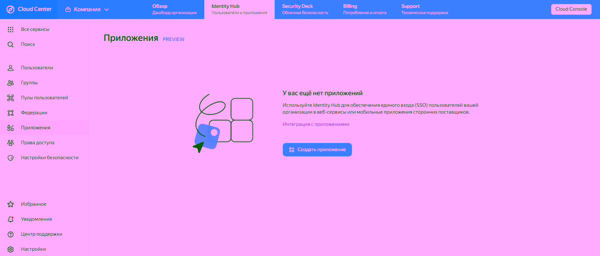 1. Перейдите в раздел Приложения, нажмите Создать приложение.